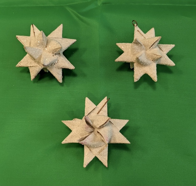 Early 20th Century. German made. Set of 4 Mica Covered Pressboard Star Christmas Tree Ornaments. Two in purple, one in yellow, and one in blue colored decoration. Each measure about 2” across.