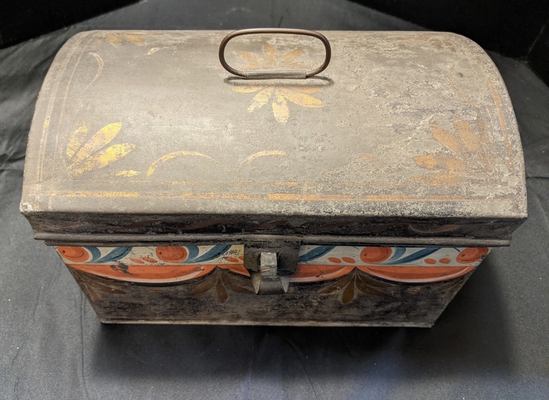 Mid 19th Century. Probably Pennsylvania origin. Early tin toleware document box in nice colors of teal blue, salmon reds, off white and gold. Measures 9 1/2” wide by 6 1/2” high by 5 1/2” wide.