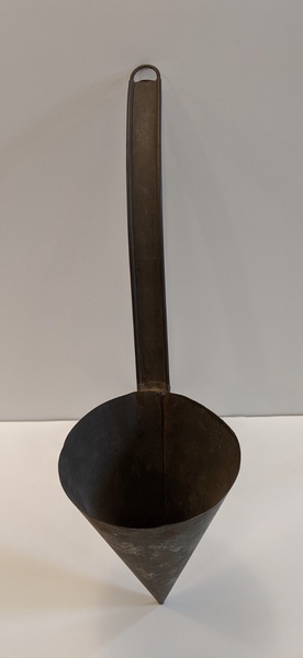 19th Century. New England origin. Nice cone shaped tin dipper with an untouched patina surface. With handing holes in top. In excellent condition. Measures 14” long.