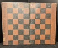 Mid 19th century. New England origin. Painted folding checkers and backgammon gameboard. Pine wood with t-square nail construction. In the best original red, black, and robins egg blue dry painted nicely craquelure surface. Measures 18 3/4” by 14 3/4” open, 14 3/4” by 9 3/8” by 2 7/8” folded closed.