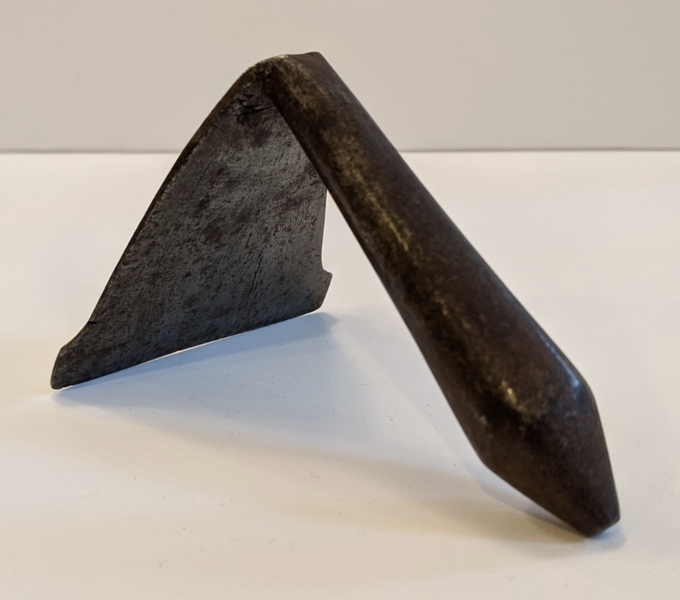 18th to early 19th century. New England origin. Forged iron fireplace hearth peel with a nice well defined figural Ram’s Head with Horns handle top. Measures 42” long and peel plate is 6 3/4” wide. Some expected wear on peel plate’s edge.