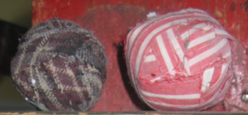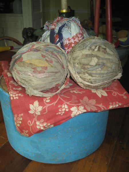 Three large early rag balls, as found in an abandoned (for many decades) cabin in the Shenandoah Valley, Va. Two are 14" in circumference, one is 17 1/2" in circumference. All are solid (not wrapped around a core). These are the last of the early rag balls x Clarke and Palmer Antiques I purchased 20 years ago. Lot of 3 rag balls.