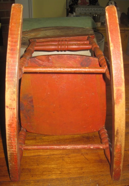 Doll rocker made of pine, in red and gold paint. Lovely condition. 6 1/2" wide; 13 1/4" tall.