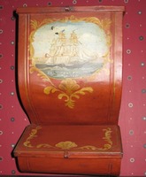 Charming coffee bin with folk art painting of a packet ship, "Baltimore Mail Packet 'United'," probably c.1960s. 8 1/2" x 14" tall. Painted inside and out.