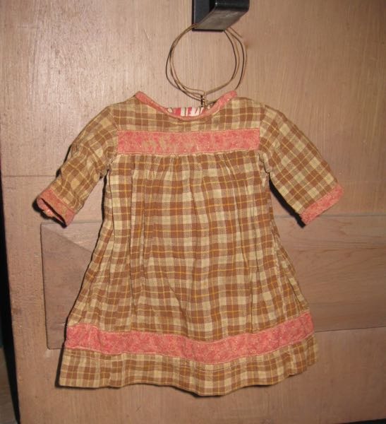 Brown and cream checked cotton doll dress, 7" long. Hand- and treadle-stitched; pink trim on collar, sleeves, and hem (no fasteners).
