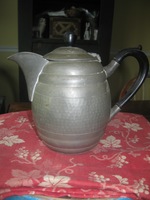 Dimpled pewter beehive tea pot; some denting. 7" tall. "Pewter/Sheffield, England" on base. Soldering to spout at least 40 years ago.