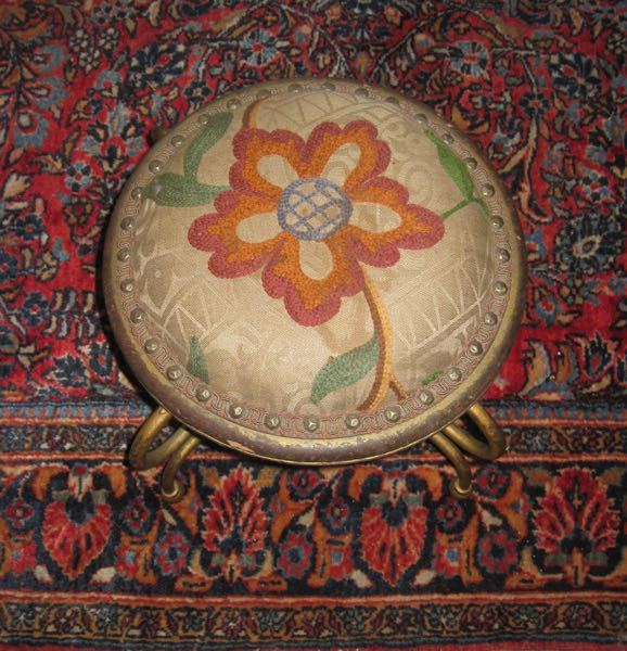 Victorian metal footstool with embroidered flower/leaves. A honey, but I've inherited a family piece, so this one is available. 7 1/4" tall x 12 1/2" pillow diameter.
