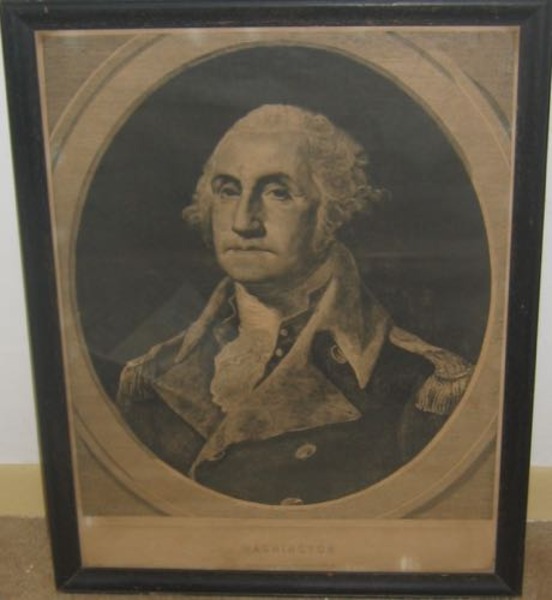 21” x 16 1/2” Possibly later frame. “Washington.” “Engraved and published by Shugg Bros 24 Cortlandt St, New York” on lower edge. Small tear at lower edge, another in upper quarter of image. According to Princeton University Library “Graphic Arts” blog: “[The Shugg] family’s printing business was begun in the early 1850s by the New York City chromolithographers at Richard Shugg & Company. ‘...Their cousins were Proctor and James Shugg, of Shugg Brothers Engravers and Lithographers in New York City....’” Found at Brimfield 20 years ago.