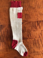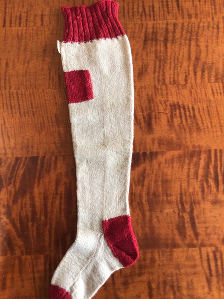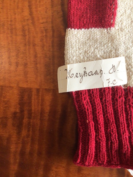 4 1/2” x 19” Single Handknit great red and cream color. Paper label with schoolgirls name.