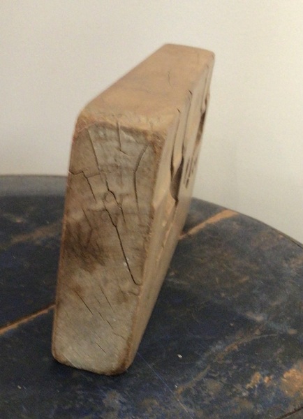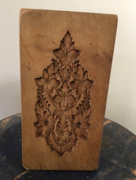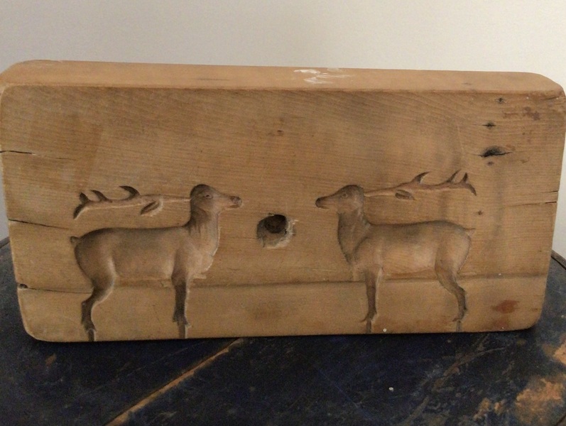 Almost 7” x 3 1/2” x 1 1/4”. 2 reindeer on one side. Heavily carved floral motif on other. Wear from age and use. See pics