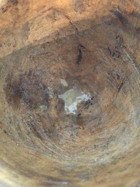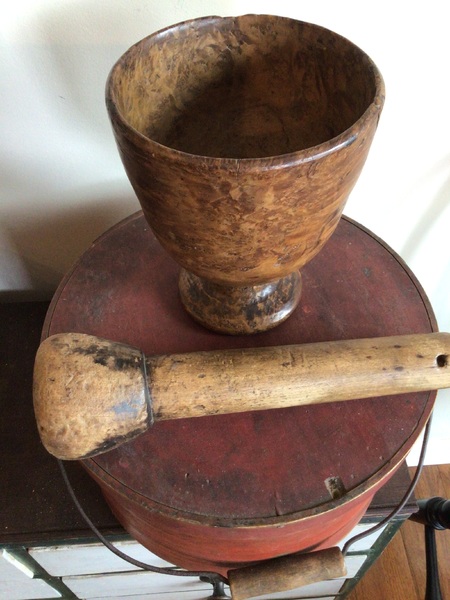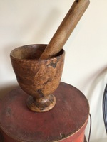 The mortar is wonderful burl. The pestle is not burl but very chunky . It measures 6” x 7 1/2”. The pestle is 11” x 3”. There is some epoxy or clear glue in bottom of mortar. See pics