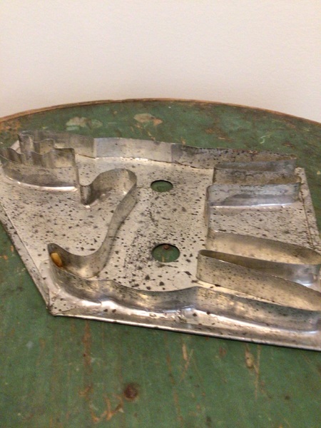 4 1/2” x 23 1/2” double sided metal sign. Farm spelled in navy blue paint. One side less wear than other. Holes for hanging. See pics