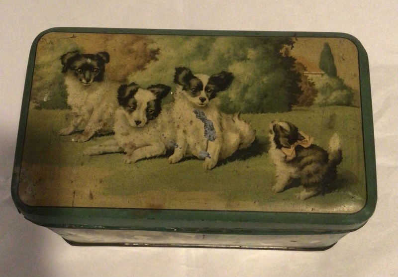 2 7/8” x 3” x 5 1/2”. Cute small box. Scrape on top. Tiny break in tin on cover.