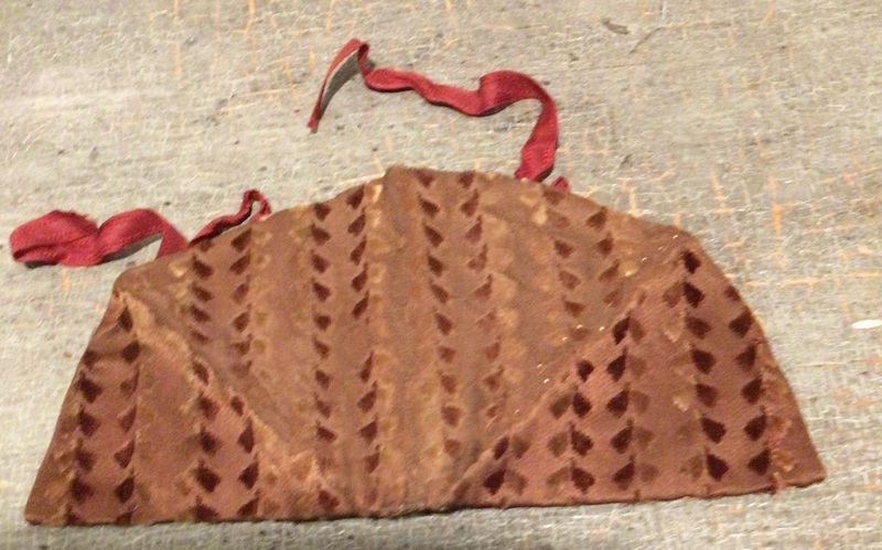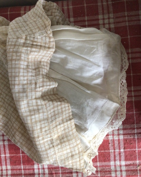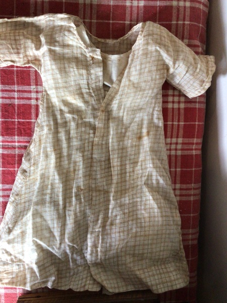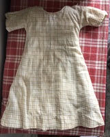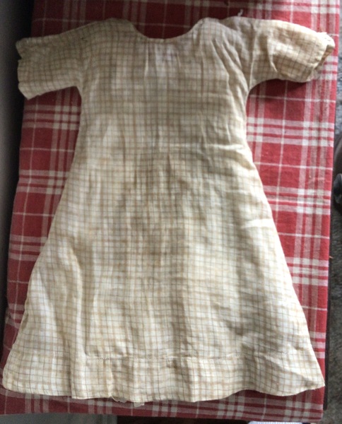 Nice old one! About 12” -13” long . End of shoulder to end of shoulder about 5”. Some staining on back. Has not been washed. Great for a small cloth doll!