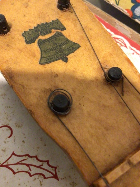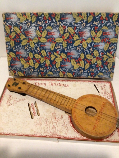 Wonderful Box with original toy inside. 2” x 8 1/4” x 14”. Some tape on edges and ripped wrap, and collapsing of box bottom.General inside soiling from age and use. Sold as found. See pics