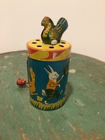 Only the largest has a spin game inside . Next to the largest is marked Toronto, Canada. Largest has a replaced stem and second from the largest has no stem. Next to the smallest has some paint chipping along the seam. Some scratches etc from age and use. Good played with condition overall. Largest is a little over 3” tall. The smallest is about 1 1/2” tall. Nice lot from a collector.