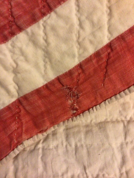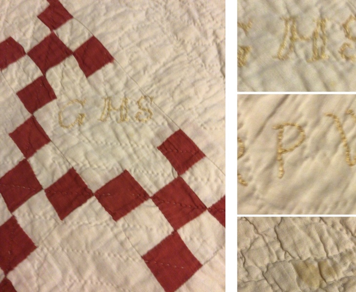 65” x 65” Finely quilted ! Some missing stitches. One break in the border pictured. A few brownish spots. Ask for more pics. Signed in two places with embroidery pale yellow initials. Very pale dated and hard to find “ 1893”. Damage reflected in price