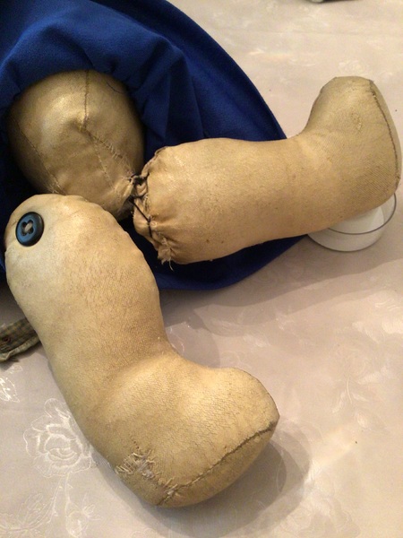 All original. Hard packed. Mend to one hand.Repair to foot. Split on side of head exposing batten stuffing. Dress apron slip and underwear.