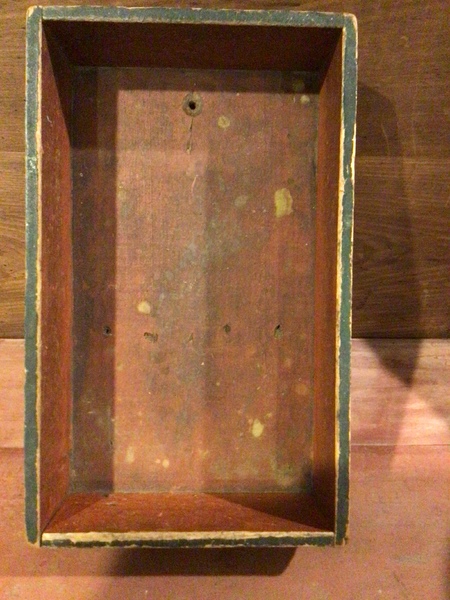 3 1/2” x 8” x 14”. Great green paint with yellow pinstripe. The interior is red. Probably started life as a wagon. Note holes in bottom in third picture. I used it as an apple box