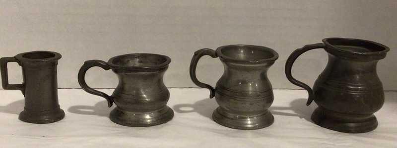 Nice early lot of miniature pewter tankards. Nice patina. Some denting due to age and use.