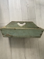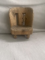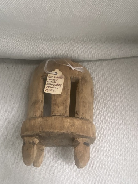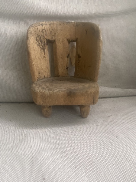 Balance toy is all wood carved with folky red, white paint with decoration on seat of platform. From the eastern shore of Md/Va found many years ago. Figure is holding on to the bent wood and balances on the edge of a 7” square seat, 18” tall. 28” between block ends of bentwood.