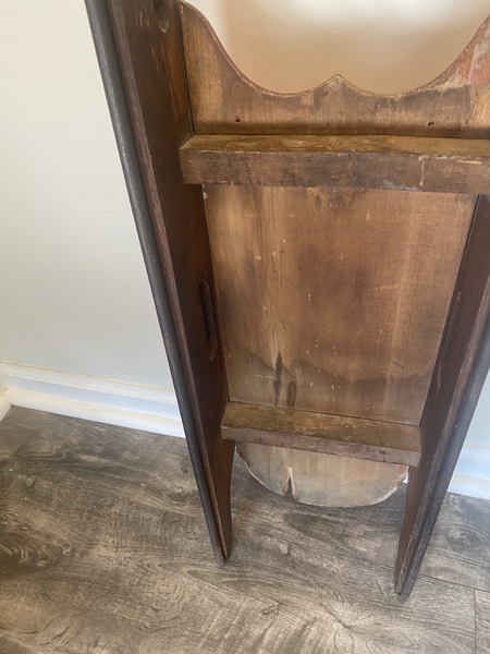 Nice sled in original ted paint and horse decoration. Small solid split in wood from usage. 38x 9 x 4”.
