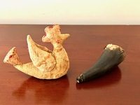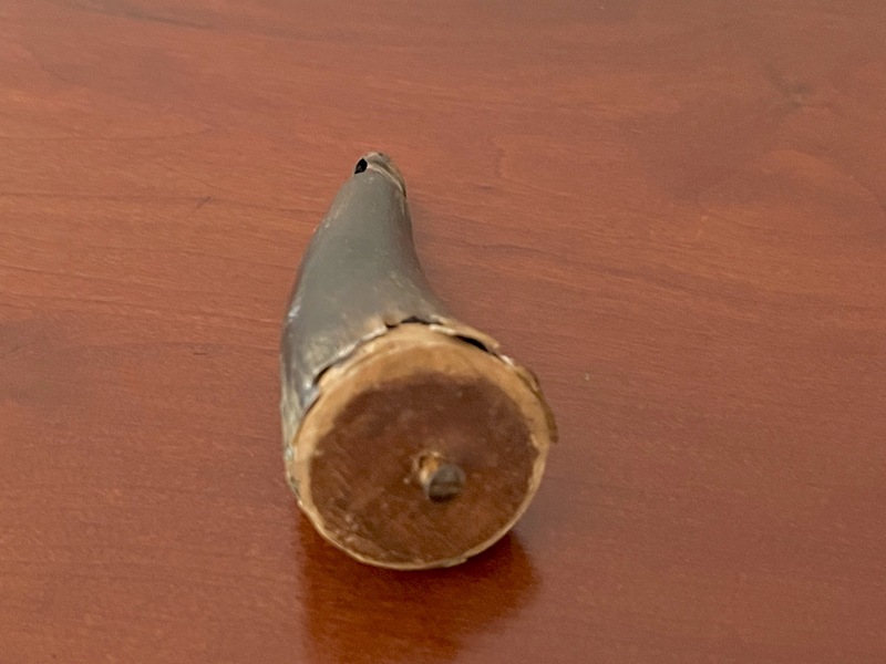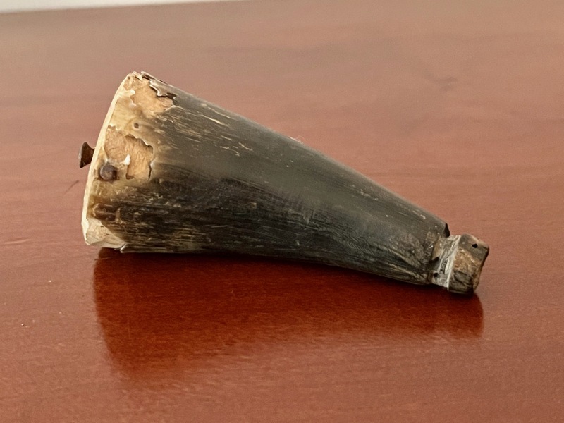 This 19th c., 3-inch pistol powder horn is an uncommon find. This size is considered to be quite petite. Also, smaller ones are less common which makes them somewhat rare compared to large rife powder horns. Powder horns were utilitarian items, so many were heavily used resulting in expected lose and wear. 3" x 1" We offer a layaway plan