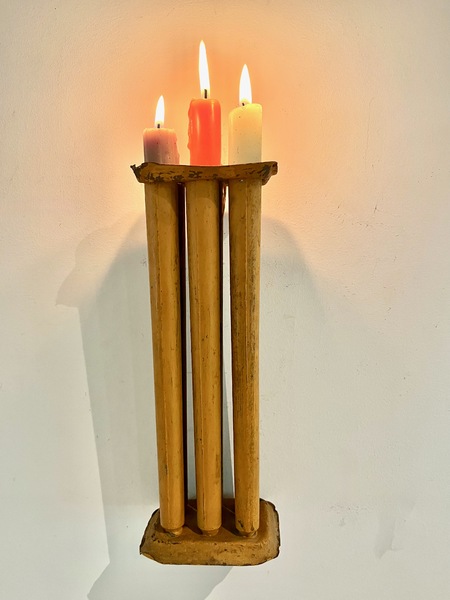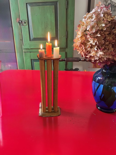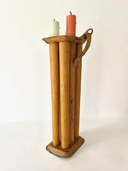This antique 6 tube candle mold is in early pumpkin orange paint. It has been used as a candle light that can be hung. It also can be used as a candle light up a flat surface. It has a couple of minor dents, all in all in good condition. 10" h x 6" wide. We offer a layaway plan.