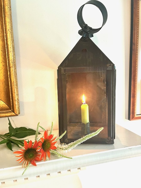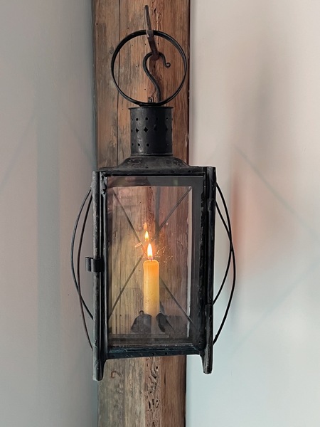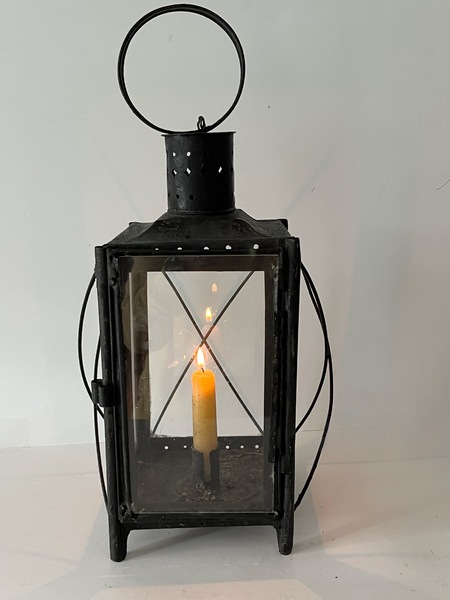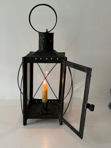 These antique lanterns were practical lighting devices prior to electricity. They provided the best light spread when hanging. They had multiple uses in both the country home and out buildings. This lantern is in very good condition. The tin sliding door allows for candle replacement. The glass panes are early a bubble or two can be seen. The candle socket is cleated through the base, dating the lantern. The tin has oxidized over time. A special early antique lantern. 14" overall x 5.5" square. We offer a layaway plan.
