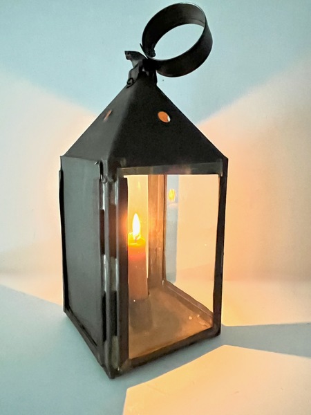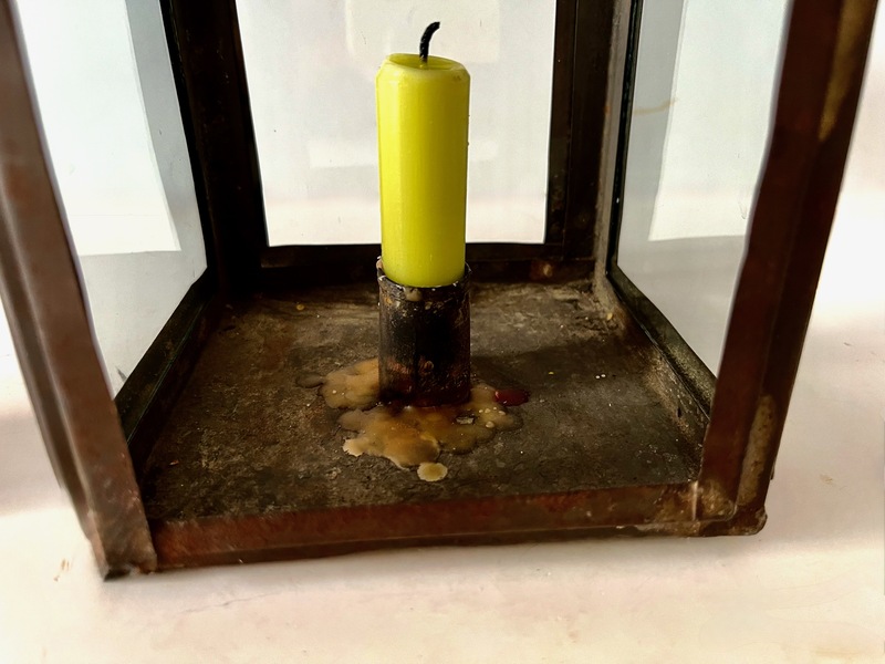 This lantern is in fine antique condition. It dates early 19th century dating around 1840. It appears to retain the original glass panes. The illumination quality is very high. It may be sited on a flat surface be hung. There are no repairs or replacements. 13" h x 5" sq. We offer layaway plans.