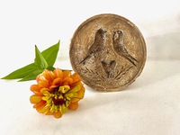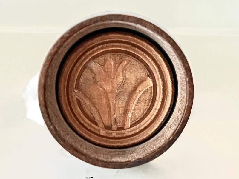 This antique wood carving of two doves and a heart was preserved as a commendable piece. Honoring most likely an ex-family member. The substance microcrystalline wax was applied, dried and decorated to preserve the butter stamp. This type of praise through commendable pieces was common among the Pennsylvania German community. 51/4" h x 5" dia. We offer a layaway plan.