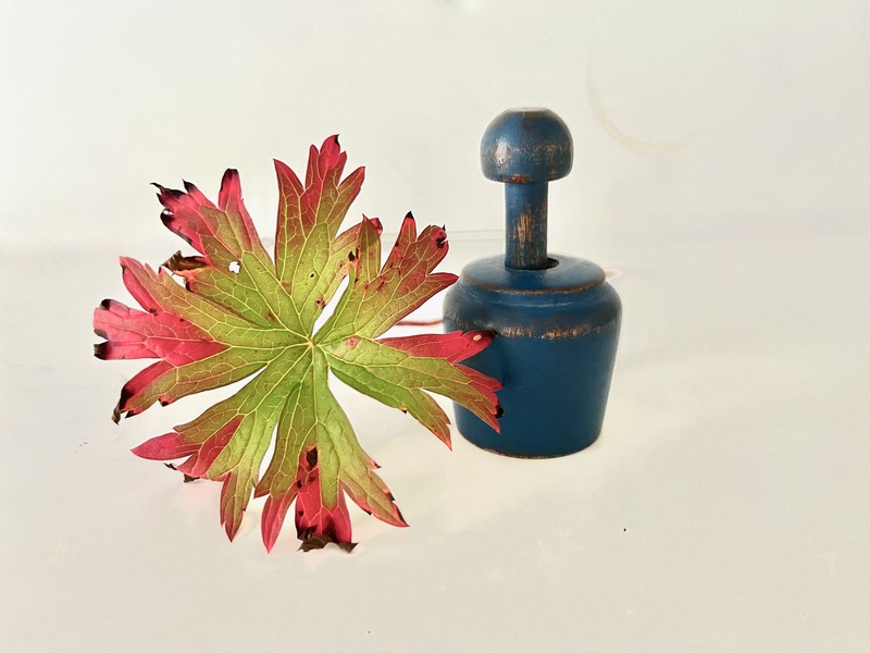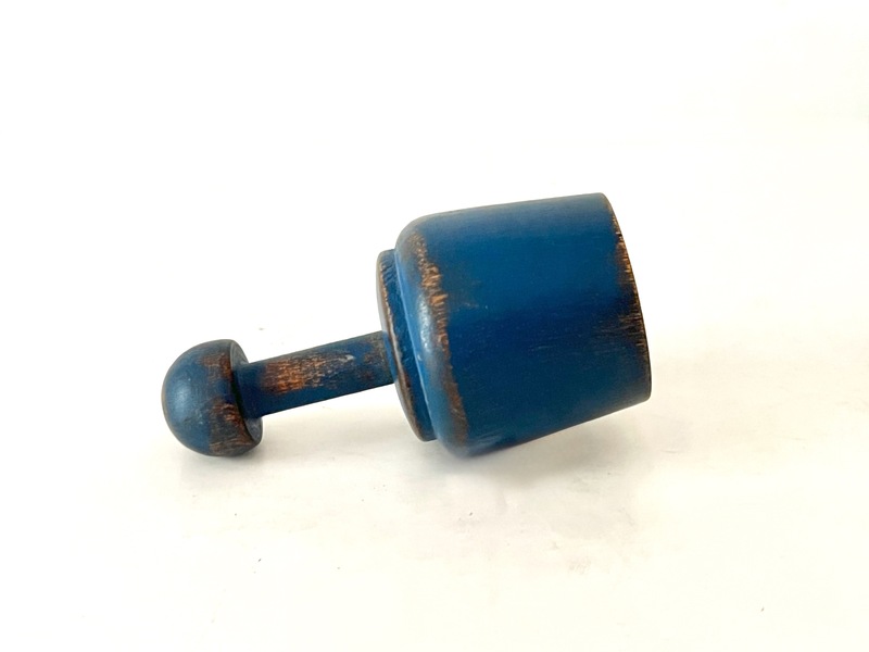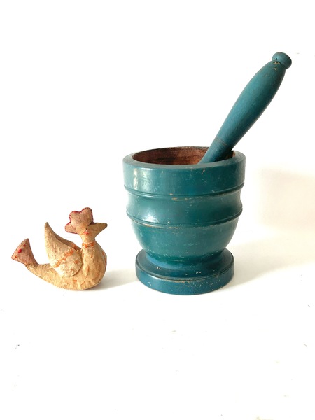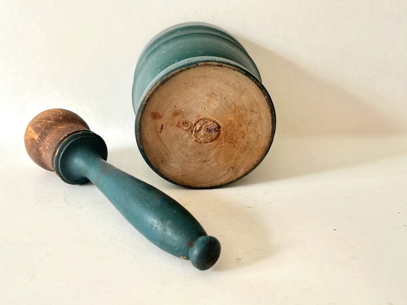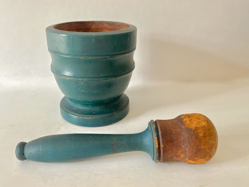 This delightful mortar & pestle is in an early bluish/green paint. Sharp and distinctive turnings. Nice expected period wear on the knob end of the pestle along with the mortar. There are some minor scratches and nicks from wear. With some roughness on the ball of the pestle. Otherwise in good strong condition. We offer a layaway plan. 4-1/4" h x 3-1/4" dia., pestle 5" 4-1/4" tall.