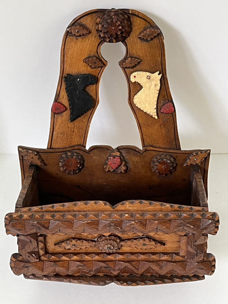Antique folk art tramp art comb box ca.1900. Pennsylvania origin. Made from old cigar boxes. Horse heads, hearts, and trinkets attached with tiny nails. 11" x 8 1/2" x 4 1/2" deep. Very good condition. There are 2 age cracks on the back.