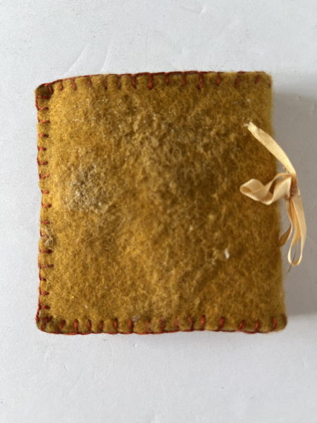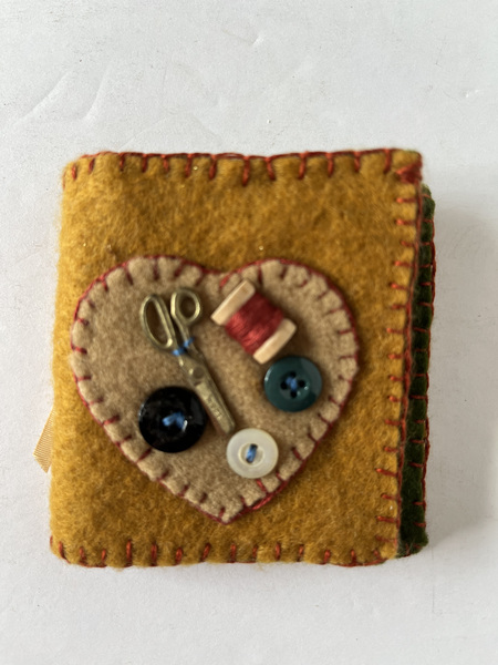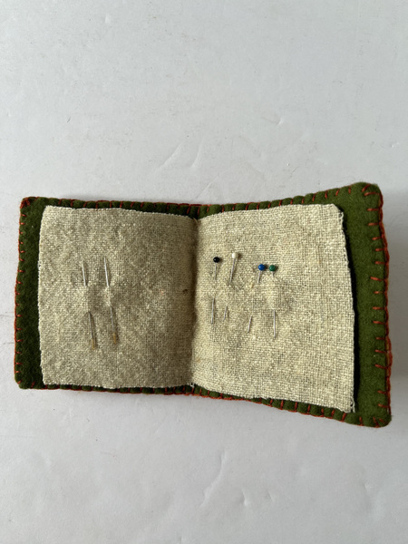 Here is a cute little felt pin keeper which was made around 1940-1950. It is 3'' square. Scissors, thread and buttons are sewn onto the cover.