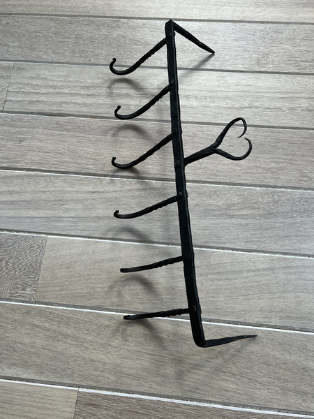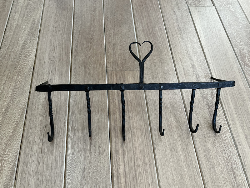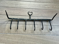 Wrought iron all-purpose hanging wall rack with a heart finial. 6 hooks, 2 spikes for hanging. 14" x 7". Excellent condition.
