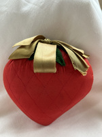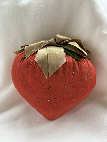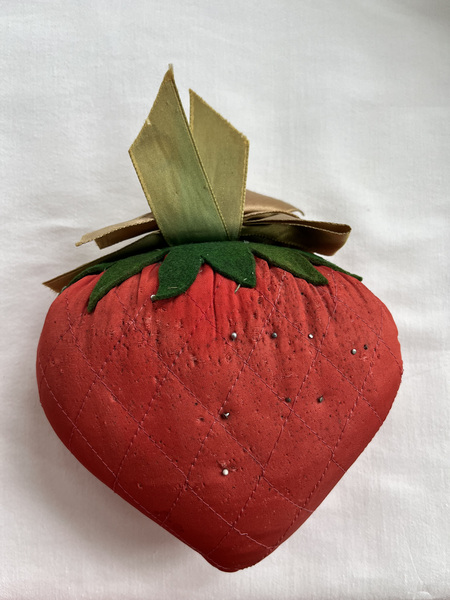 Hard stuffed large silk strawberry pincushion ca. 1920. 5 1/2" x 5". There are 2 sets of leaves on the top of the strawberry. One felt top seems to have been attached later and the early, silk original one was attached by the last owner. Diamond pattern stitching on the silk body.