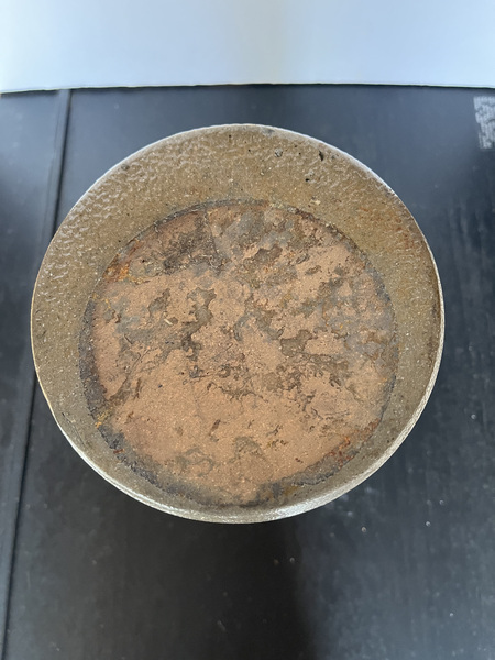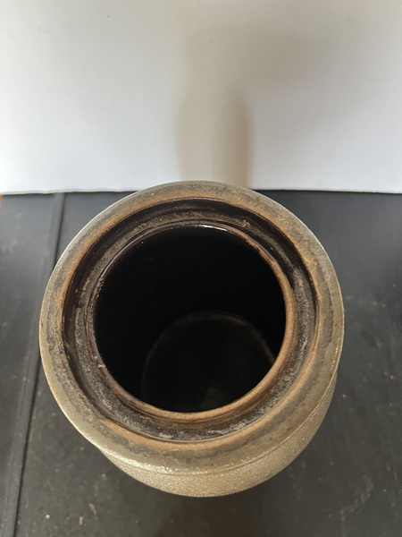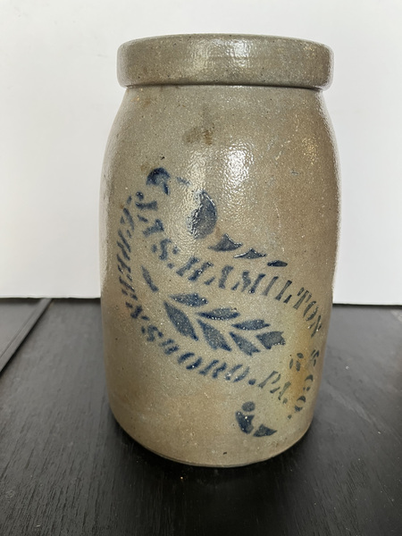 8 1/2" tall stoneware wax sealer crock with leaf decoration. The top diameter is 4 1/4". The bottom is 5 3/8" diameter. It doesn't show this in the photo, for whatever reason. Greensboro, PA. No cracks. There is a tiny flea bite on the rim.