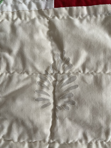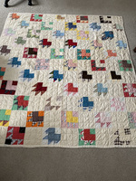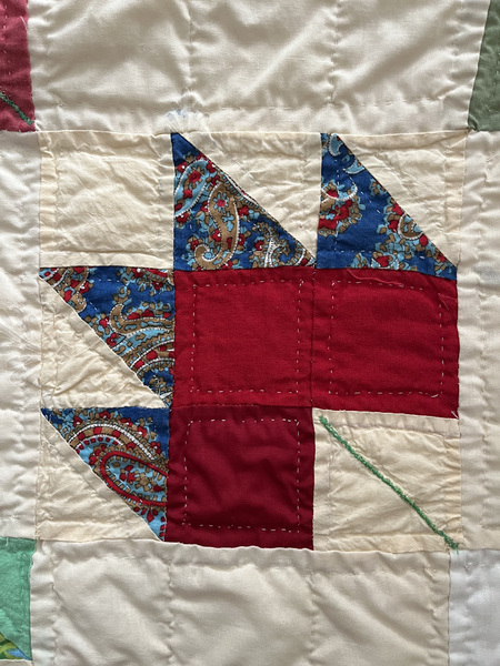 This patchwork quilt was made in West Virginia ca. 1940-1950. Some of the cream colored patches have a cut-out design on them. I tried to show it on the last photo. The quilt measures 79" x 72". It is in excellent condition with no tears or stains.
