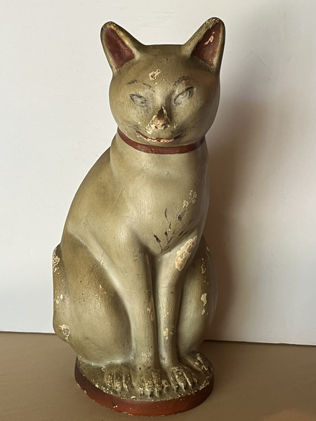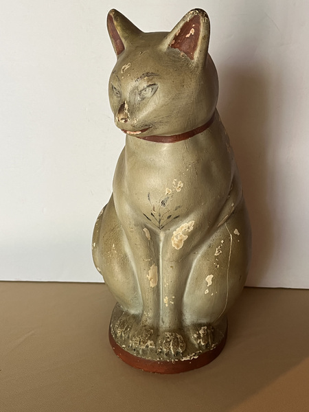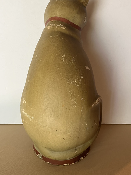Here is an early, large chalk ware cat in original, early khaki paint with red paint on ears, mouth, nose, and base. it is 15 1/2" tall x 7" wide. It has several wear areas of paint as shown, and a repaired crack on the right side of the thigh and leg, about 8" high from base. The line on the back is only a scratch. The nose appears to have a chip, however it is NOT a chip, but paint wear. I've had this cat sitting on my mantle for a long time.