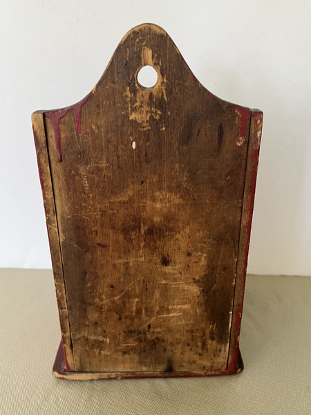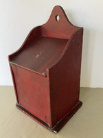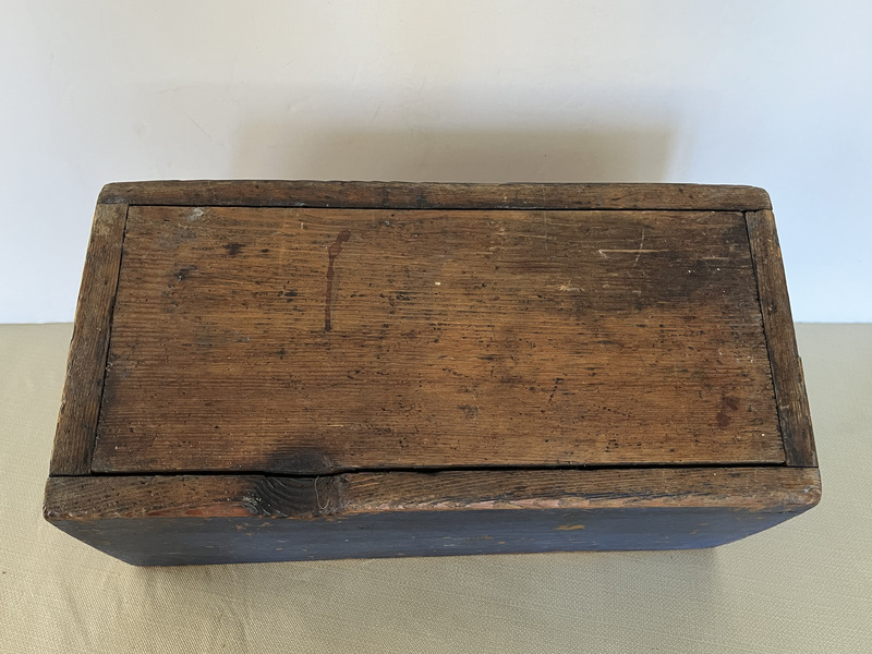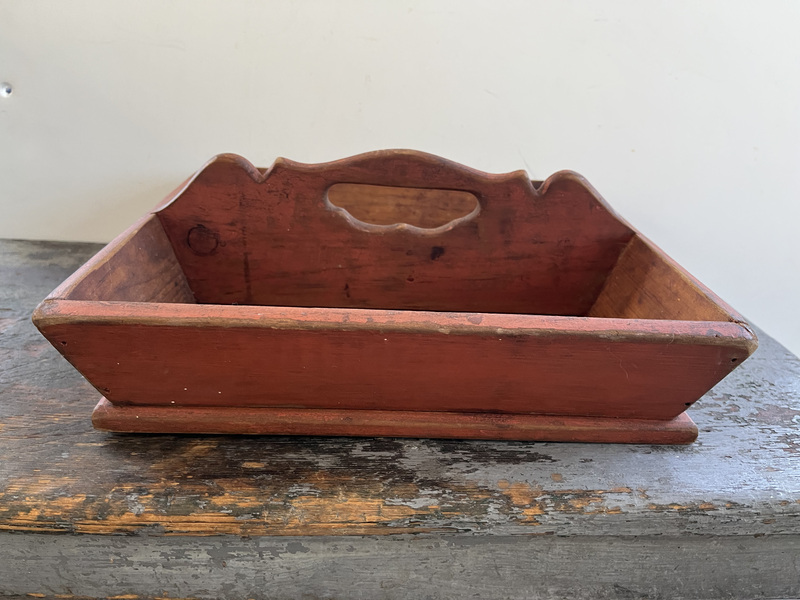 19th c. carrier in original, early, bittersweet paint. It has canted sides, small nails, and a cut-out handle. It measures 12" x 101/2" x 5" tall, including the handle. It's in wonderful condition with no issues!