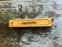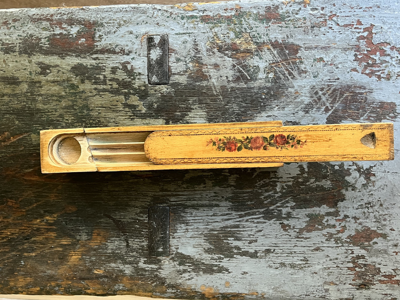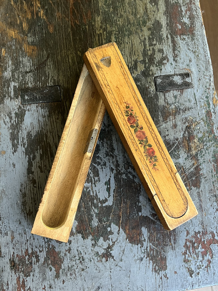 Notched slide-lid pencil box with stenciled or painted flowers on lid and decorated border. It swivels to reveal another compartment underneath. It also has an escutcheon for a key, which is missing. The end of top compartment has been glued. 9 1/4" long 1 3/4" wide 1 1/2" deep. 1890-1910.