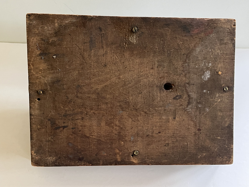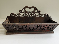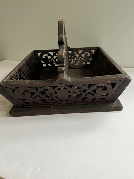 Unusual cutlery tray with intricate carvings on all sides and divider. It is mounted on a base. It has a dark, flat finish. I can’t tell if it’s painted or stained. It shows typical wear. It is held together with screws and tiny nails. Very sturdy and heavy.