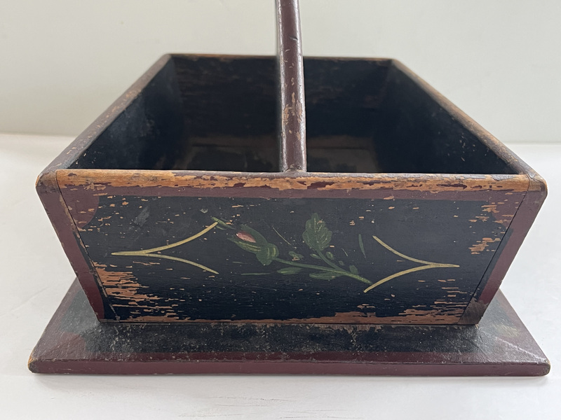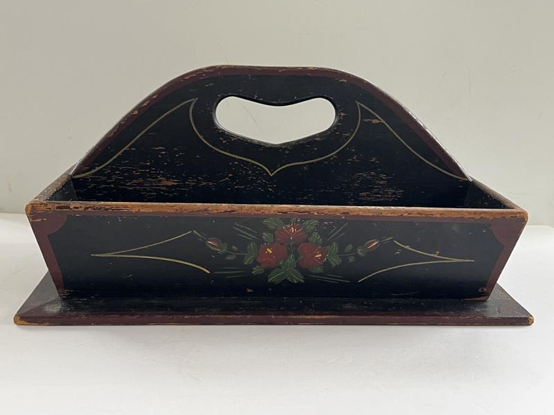 Early, original black painted cutlery carrier with a heart cut-out handle. The paint appears to be black, but it has a dark blue hue to it at different angles. There's a red trim on the edges and painted flowers and leaves. 14 3/4" x 9 x 7 1/2" tall, including the handle.