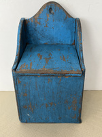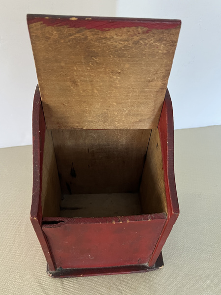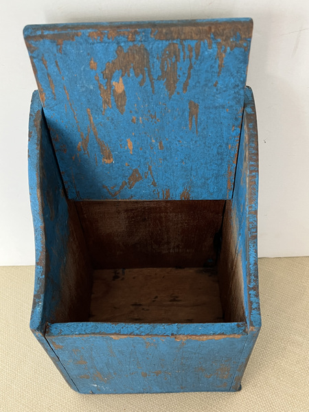 Late 19th c. wooden salt box in old blue paint. It has a hole for hanging and tiny, early nails. 8 3/4" tall, 5" wide, 5" deep. Great condition with great wear.