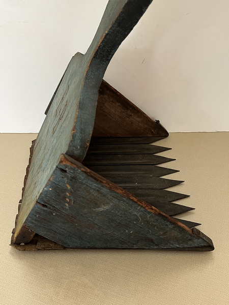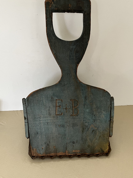 Unusual, original, early paint cranberry scoop with carved initials " E + B " on front panel. The rake part is heavy tin or iron with some rust. When I purchased it the rake was detached and the original screws were loose. I re-attached it, using the original, early screws. There is a missing piece of wood on each side. A nice, early, painted piece!