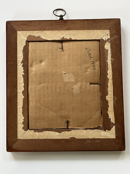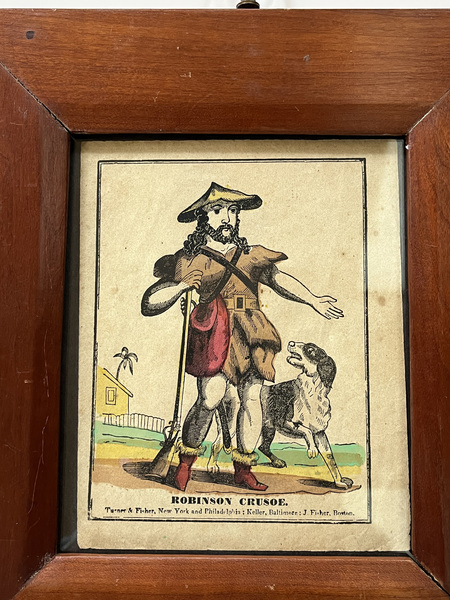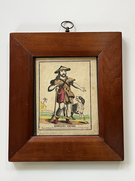 Robinson Crusoe Hand-colored block print by Turner & Fisher, Boston, dated 1854 on back of print. The frame is 10 1/4" x 9 1/8". Sight size is 6 1/2" x 5 1/4". Good condition with minor foxing.