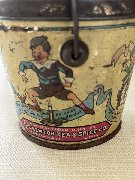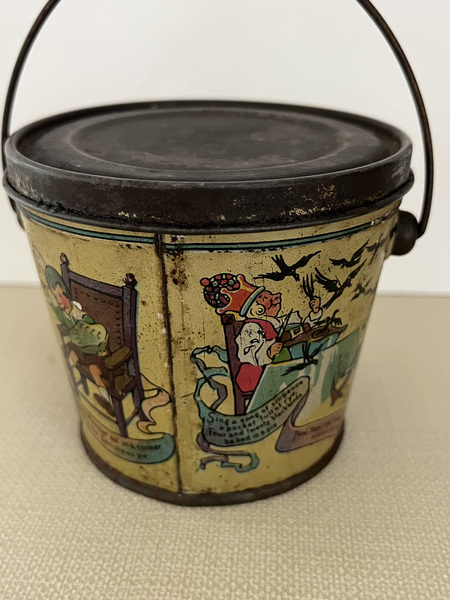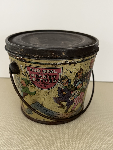 Very early miniature lithographed tin peanut butter lidded bucket with lid. 3" tall, 3 1/2" wide on top, 2 3/4" wide on bottom. "Red Seal Peanut Butter" on bucket. Manufactured only by The Newton Tea and Spice Co., Cincinnati Ohio. "CANCO" on bottom. There are lithographed figures of nursery rhyme characters on the bucket.
