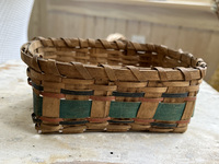Here is a small or miniature Indian basket with green, red, and black painted splints along with the natural color splints which are woven. There is a wrapped rim. The basket measures 6" x 4" x 2 1/2" tall. The condition is very good. There are 3 missing splints on one side of the basket rim, as seen in photo #3.