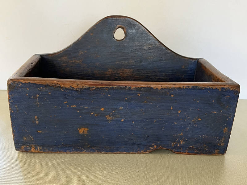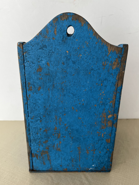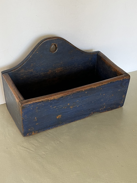 19th c. blue wall box in early, original paint. 12 1/2" x 6 3/4" x 8" tall. Square nails. Wonderful wear! One small dark indentation along bottom, as seen in photo. A great piece with the best blue paint!