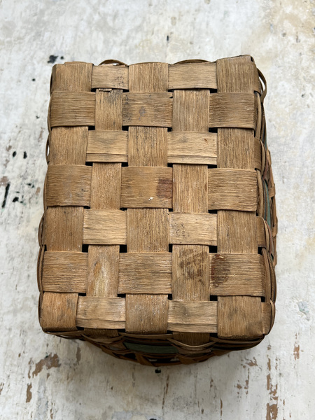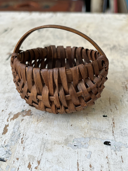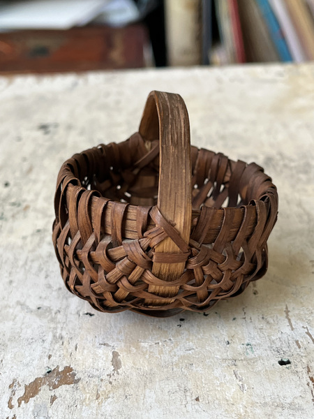 Miniature splint basket with handle in nice small size (2 1/2" x 2 1/4" x 2 1/2" tall, including handle.) It is in excellent condition except for a tiny missing piece on the X where the handle is inserted.